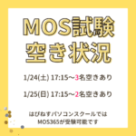 - MOS試験1/24(土)17:15~3名空きあり。1/25(日)17:15~2名空きあり。MOS試験1/24(土)は17:15~3名空あり、1/25(日)17:15~2名空きありです。 当会場では、 Excel365 ・Word365・ PowerPoint365・Excel365Expert・Word365 […]