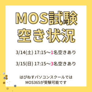 MOS試験3/21(土)は17:15~1名空あり、3/22(日)17:15~3名空きありです。