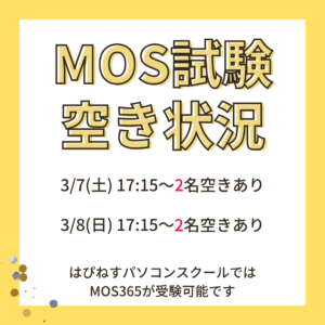 MOS試験3/7(土)17:15~2名空きあり。3/8(日)17:15~2名空きあり。新着!!